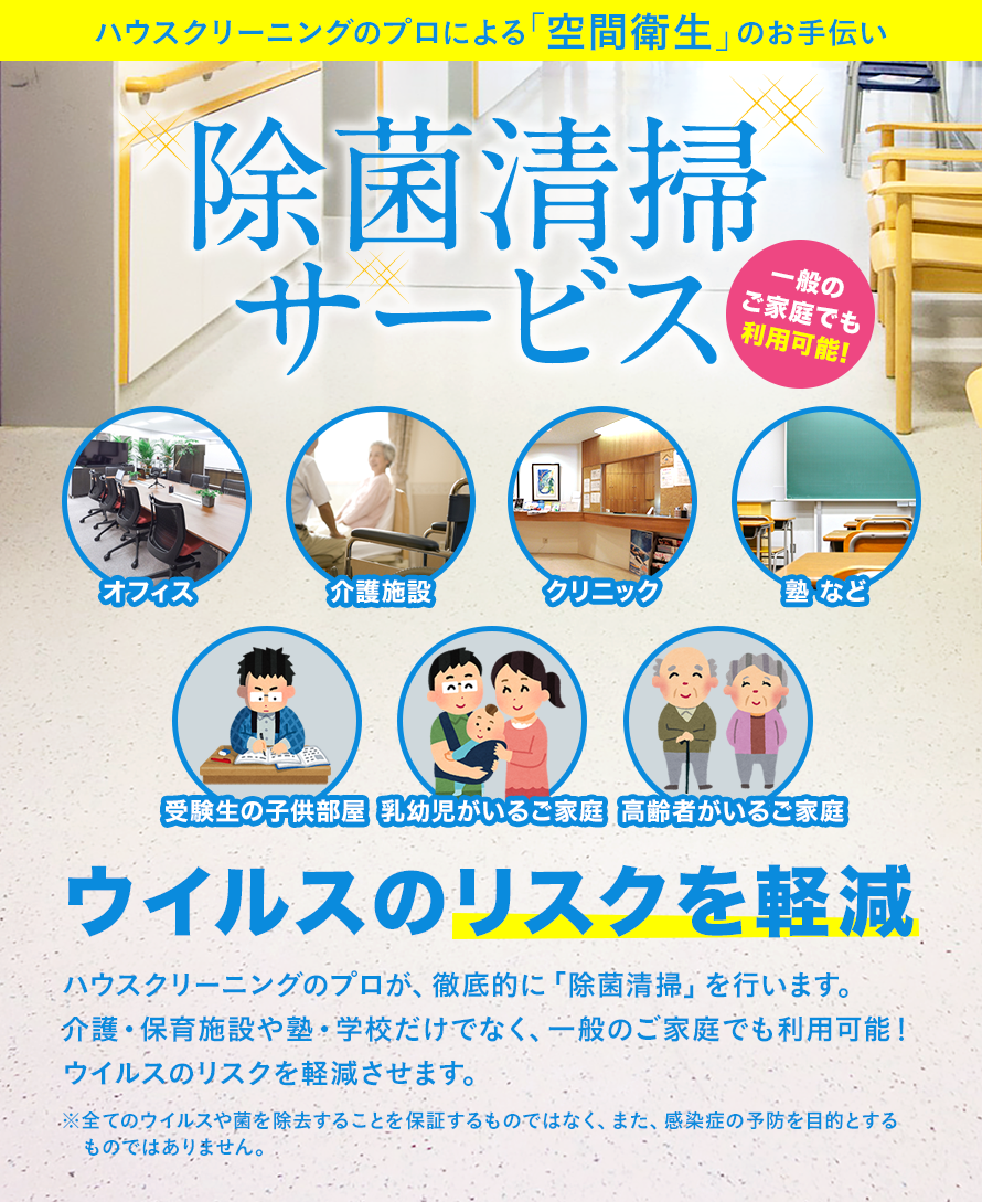 ハウスクリーニングのプロが、徹底的に「除菌清掃」を行います。